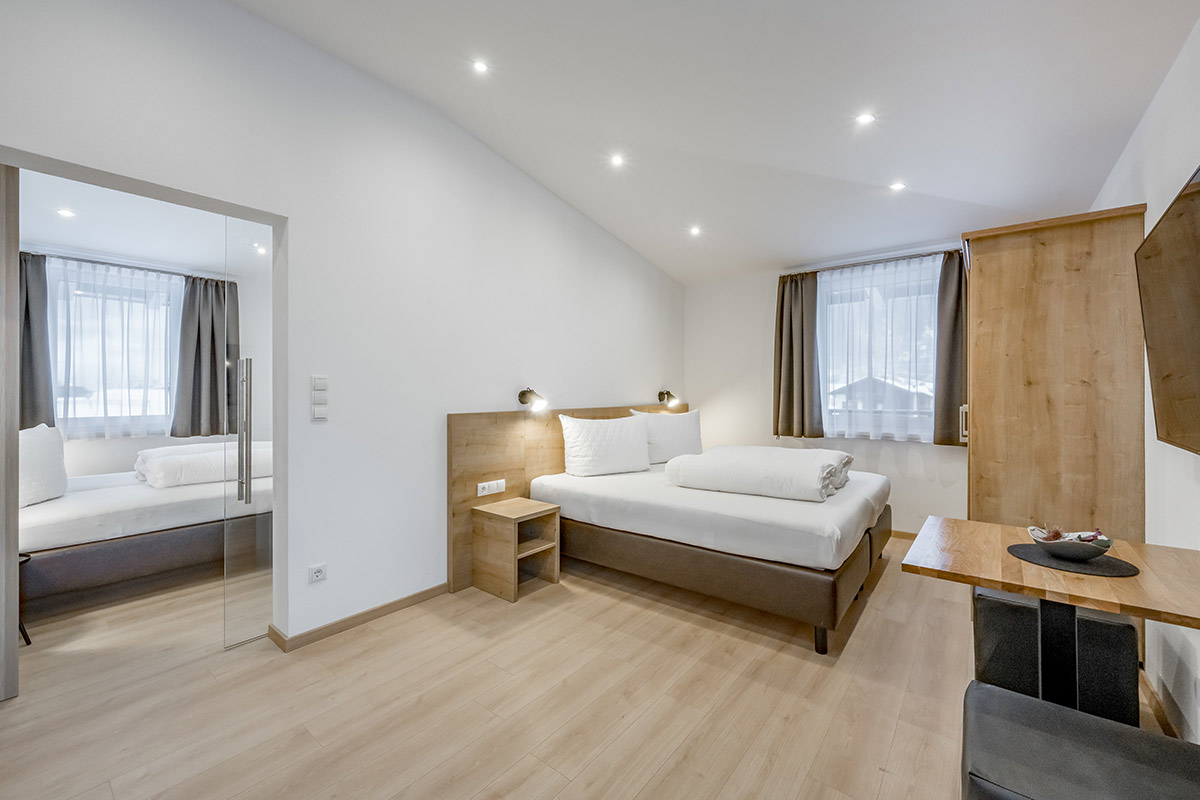 - 1 Schlafzimmer mit Doppelbett, Flat-TV und Zimmersafe sowie angrenzendem weiterem Schlafzimmer mit einem weiteren Doppelbett (getrennt durch eine Glasschiebetüre)